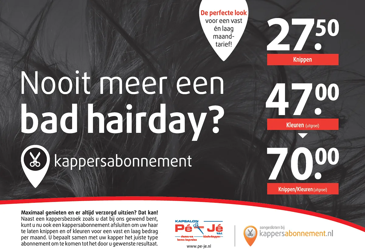 Bij Kapsalon Pé-Jé gebruiken we alleen producten van de beste kwaliteit. We zijn er voor jong en oud en verzorgen allerlei soorten haarbehandelingen. Onze medewerkers helpen je graag met het vinden van een kapsel dat écht bij je past.
